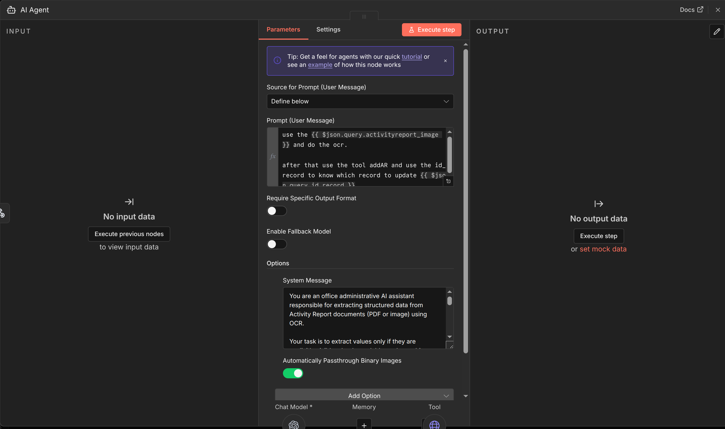 With customized UI enabled, now we’re done with JETData.AI side, and can move on to the n8n side. Below are all the node used for the OCR, we’ll be using webhook, AI Agent, OpenAI, and HTTP request tool.
