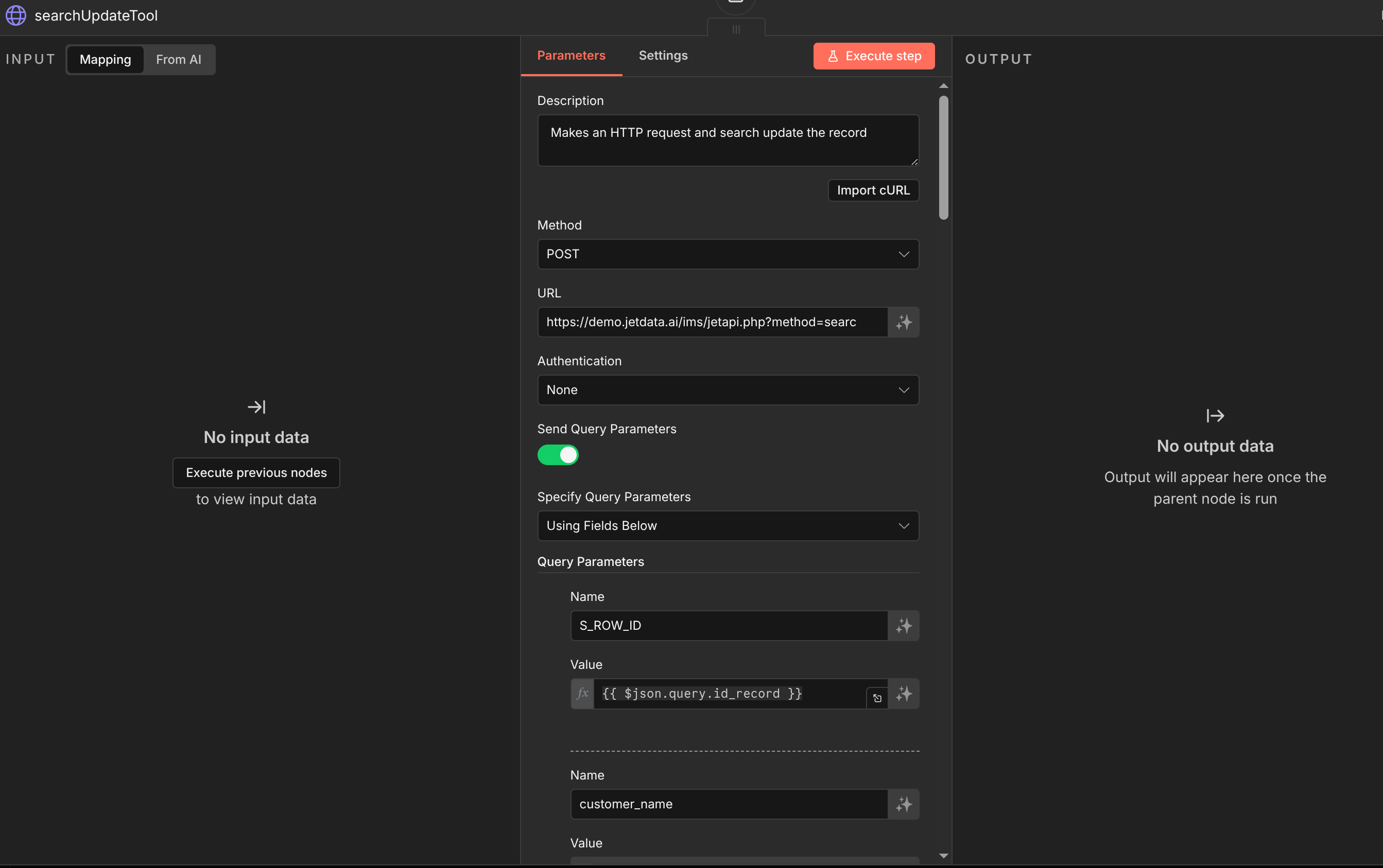 after that use the tool searchUpdateTool and use the id_record to know which record to update {{ $json.query.id_record }}