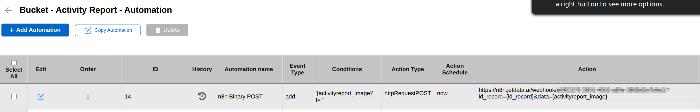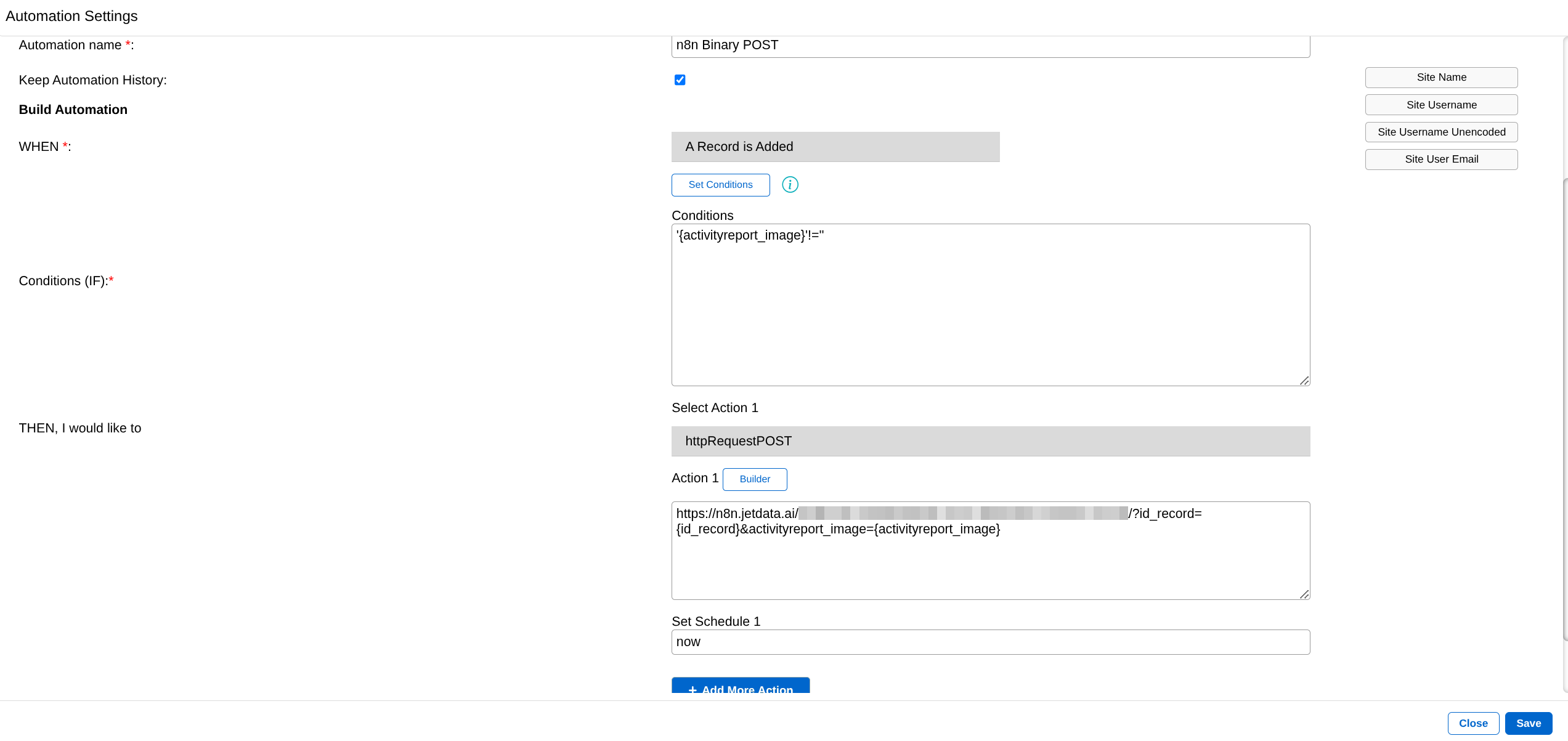 When the automation conditions are met, then the automation will do a HTTP Request POST to n8n webhook and also send the fields of id_record and activityreport_image to the webhook.