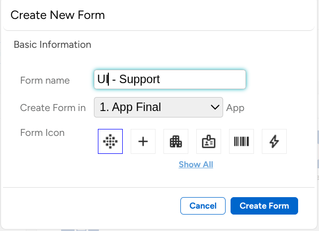 First steps, of course, Forms!, we need to create the Form for the backend where it will hold the data, and the Form for Customized UI. For backend form I’ll be naming it Bucket - Support and UI UI - Support