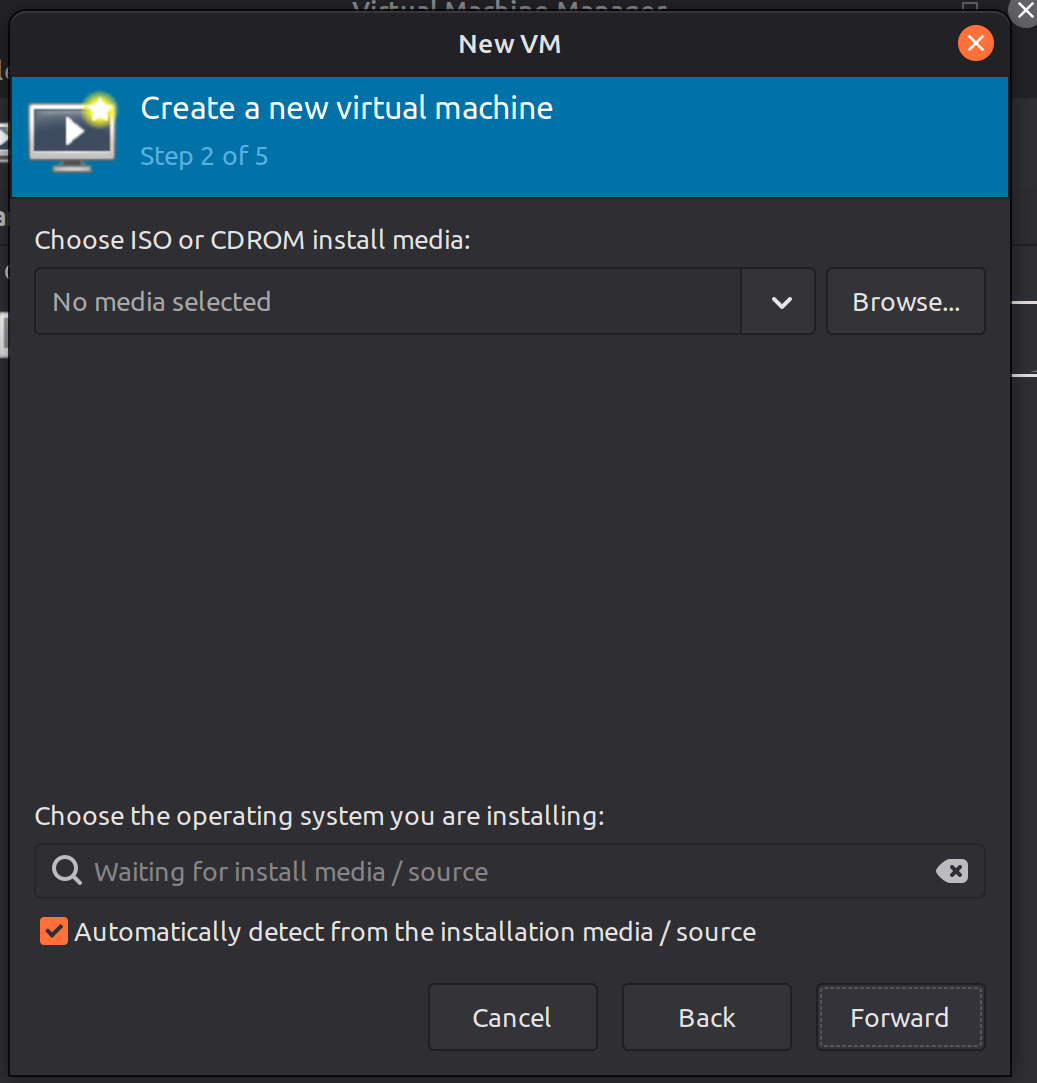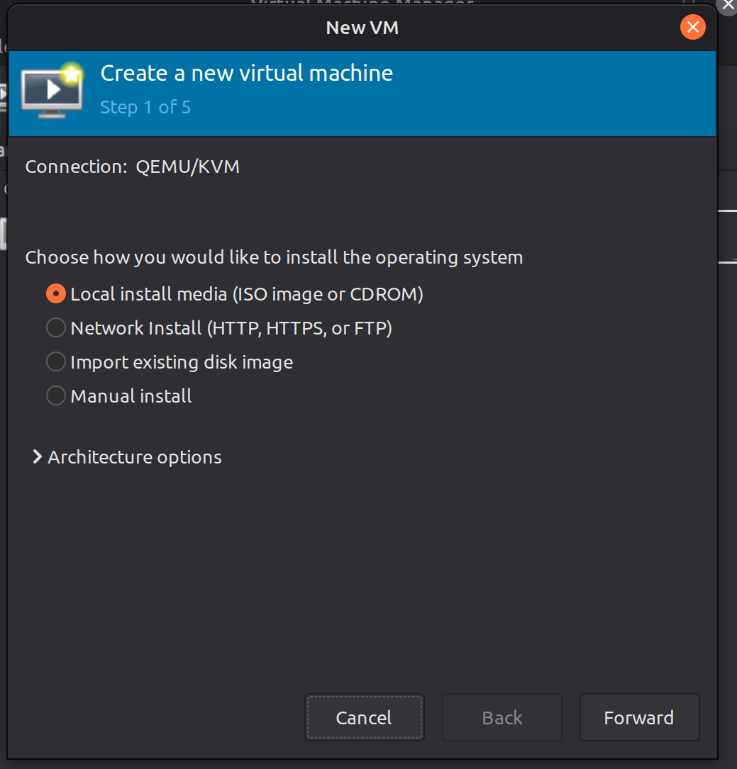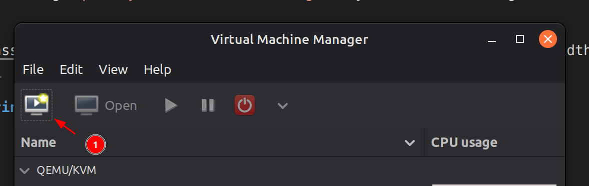 Deployingg VM in QEMU/VMM is pretty straight forward, first just click the “Create a New virtual Machine” button top left of the VMM GUI.